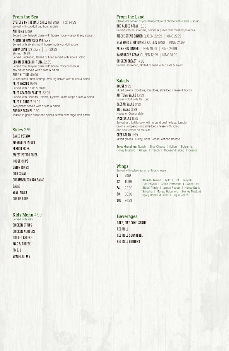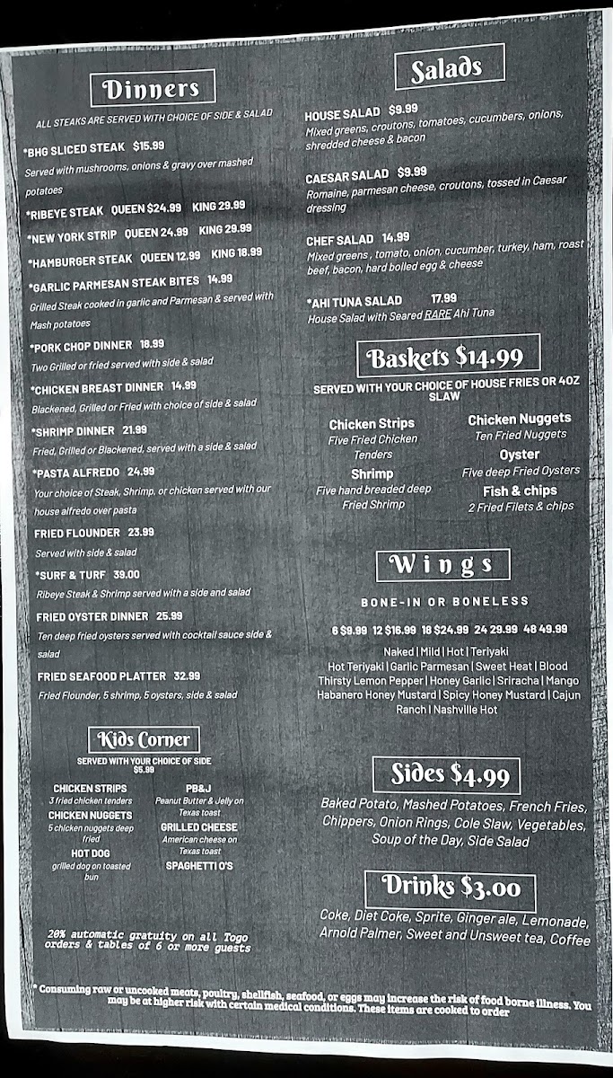 The menu features a remarkable array of options from the land, including succulent cuts like the Bhg Sliced Steak, Ribeye, and Prime Rib Dinners. Seafood lovers will delight in the Fried Flounder and Fried Oyster Dinner, while appetizers such as Fried Pickles and Loaded Potato Wedges complement the robust main courses.